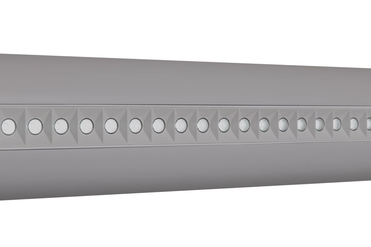 The Boring Light is a 1500mm long, 150mm wide pendant light with a rounded bottom side, designed to meet all UGR norms. It provides both uplighting with tuneable white and downlighting at 3000 Kelvin. The fixture features a tuneable grey color and is compatible with DALI control systems, offering reliable and adjustable illumination for various environments.